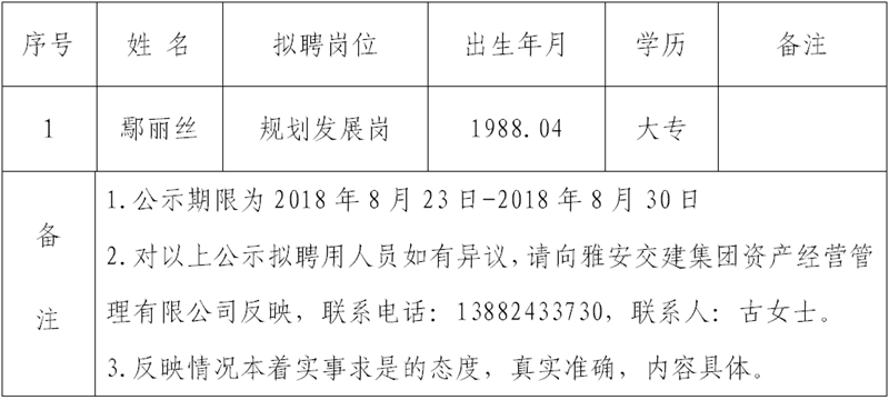顺利获得公开报名、资格审查、综合测试等程序,经币游集团资产经营管理有限公司研究确定以下1名拟聘用人员,现公示名单如下: