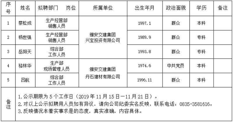 币游集团所属子公司拟聘用人员公示(兴宝公司、丹石公司)