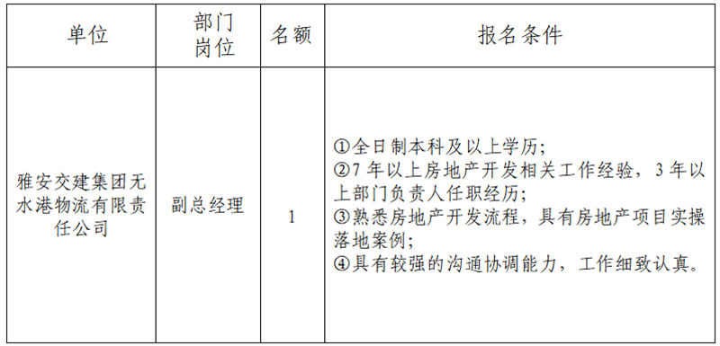 根据开展需要,现面向社会公开招聘雅安市交通建设(集团)有限责任公司(以下简称“币游集团”)所属子公司经营班子人员1名,现将有关事项公告如下: