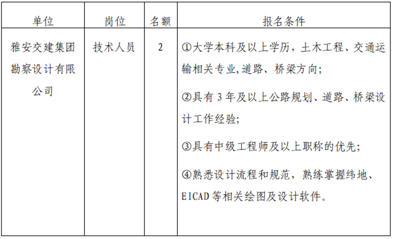 1.报名。公告发布在雅安市交通建设(集团)有限责任公司门户网站,自发布之日起即可报名,截止时间为2019年4月30日18:00。网上报名,报名者须如实填写《报名登记表》。 网上报名。在规定时间内将填写好的《报名登记表》、本人有效身份证、毕业证、职称、执业资格及工作业绩等证明材料以电子文档的形式发送至邮箱2018523008@qq.com(姓名+应聘公司名称+应聘工作岗位)。咨询电话:0835-5897859。