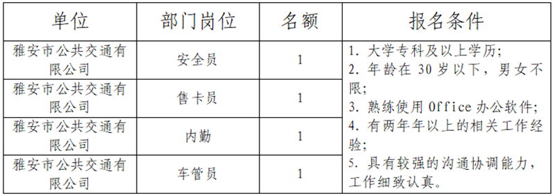 1、报名。公告发布在雅安市交通建设(集团)有限责任公司门户网站,自发布之日起,即可报名。截止时间为2019年6月8日。网上报名,报名者须如实填写《报名登记表》。在规定时间内将填写好的《报名登记表》、本人有效身份证、毕业证、职称、执业资格及工作业绩等证明材料以电子文档的形式发送至邮箱104515026@qq.com(姓名+应聘公司名称+应聘工作岗位)。咨询电话15908143154。