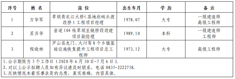 雅安市交通建设(集团)有限责任公司拟聘用人员公示(项目管理公司人才引进)