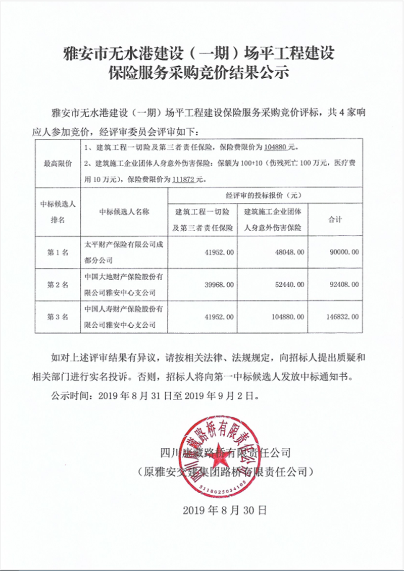 雅安市无水港建设(一期)场平工程建设保险服务采购竞价结果公示