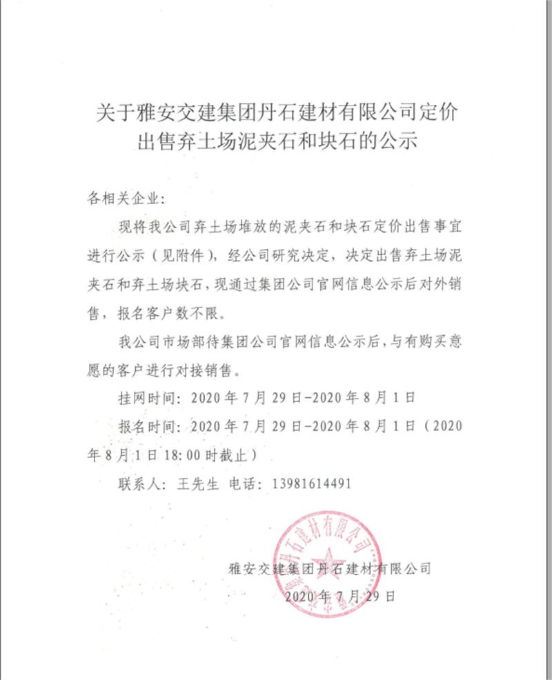 关于币游集团丹石建材有限公司定价出售弃土场泥夹石和块石的公示