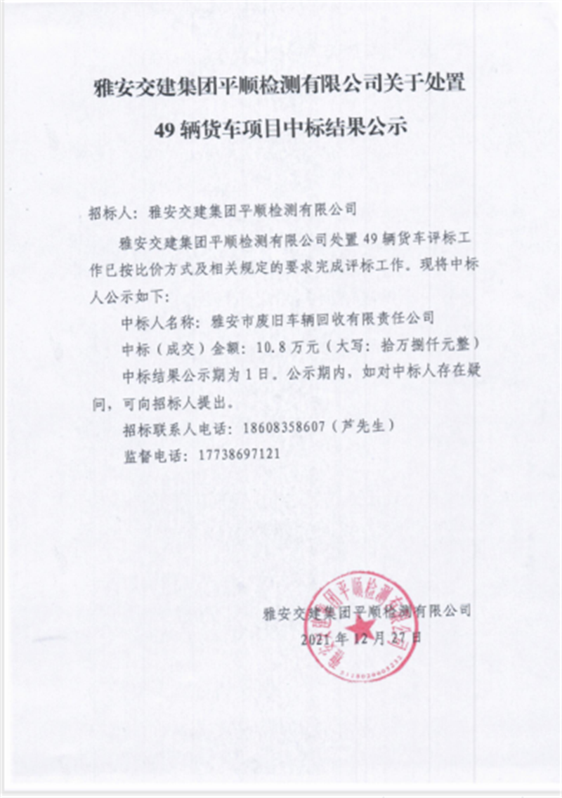币游集团平顺检测公司关于处置49辆货车项目中标结果公示