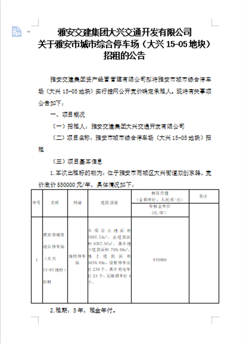 币游集团大兴交通开发有限公司关于雅安市城市综合停车场(大兴15-05地块)招租的公告
