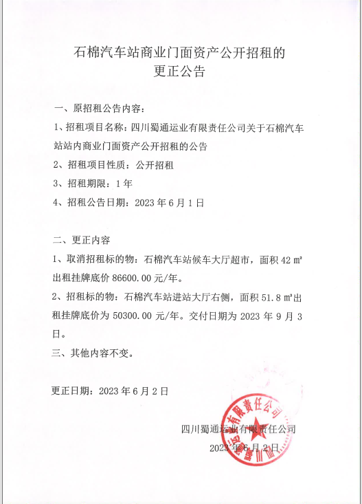 蜀通公司石棉汽车站商业门面资产公开招租的更正公告