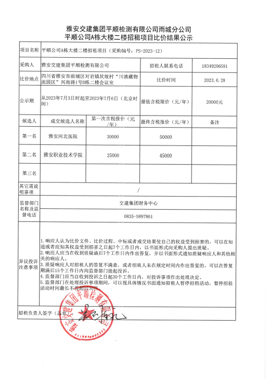 平顺公司A栋大楼二楼招租项目比价结果公示