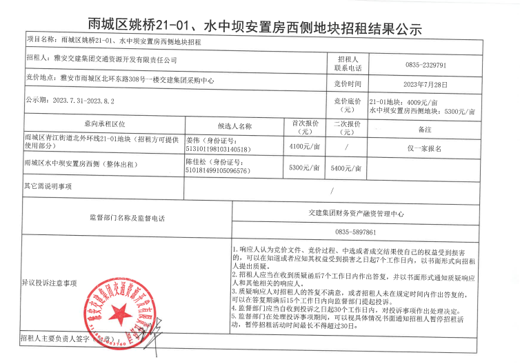 币游集团交通资源开发有限责任公司关于雅安市雨城区姚桥21-01和水中坝块块招租结果公示