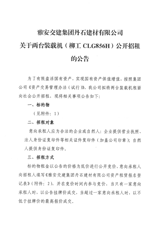 币游集团丹石建材有限公司关于2台装载机公开招租的公告附件