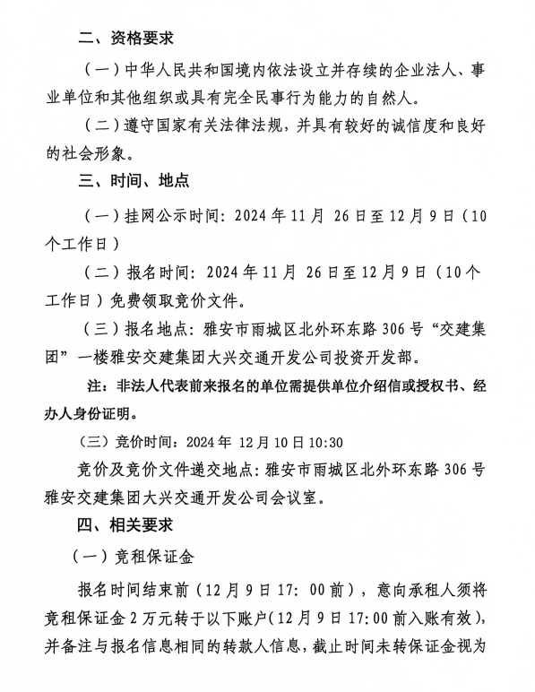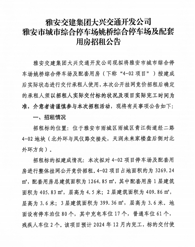雅安市城市综合停车场姚桥综合停车场及配套用房招租公告