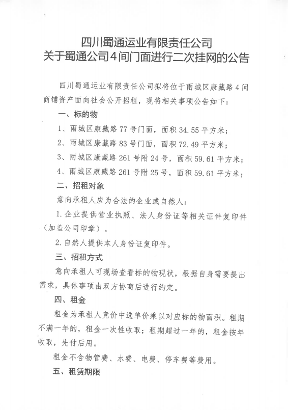 四川蜀通运业有限责任公司关于蜀通公司4间门面进行二次挂网的公告