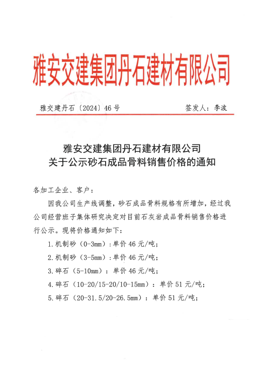 关于公示砂石成品骨料销售价格的通知