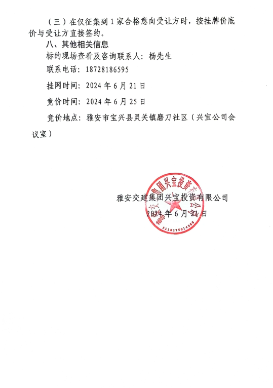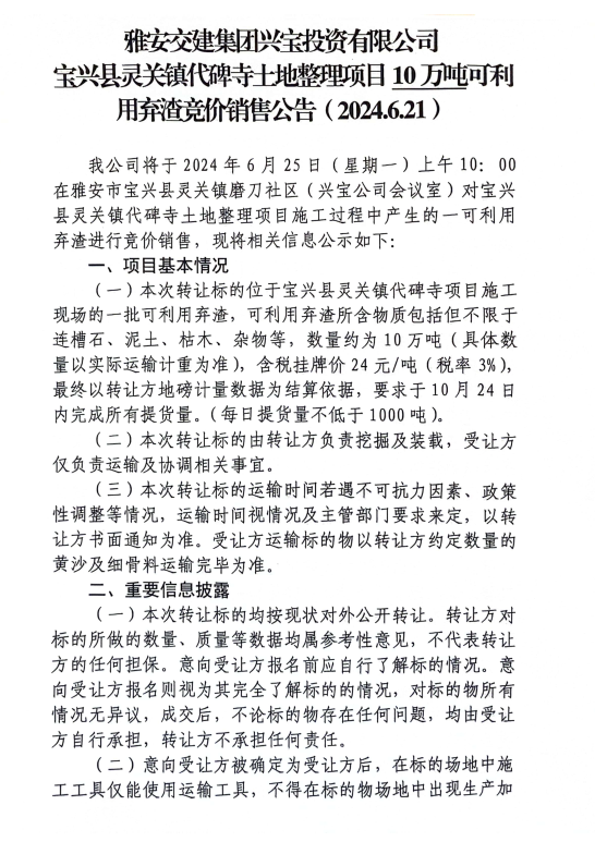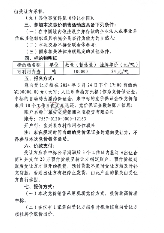 币游集团兴宝投资有限公司宝兴县灵关镇代碑寺土地整理项目10万吨可利用弃渣竞价销售公告(2024.6.21)