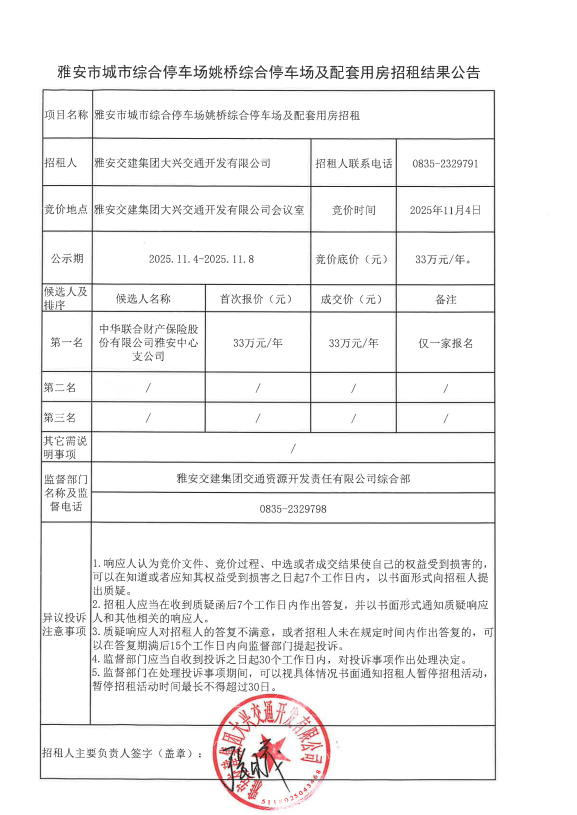 雅安市城市综合停车场姚桥综合停车场及配套用房招租结果公告