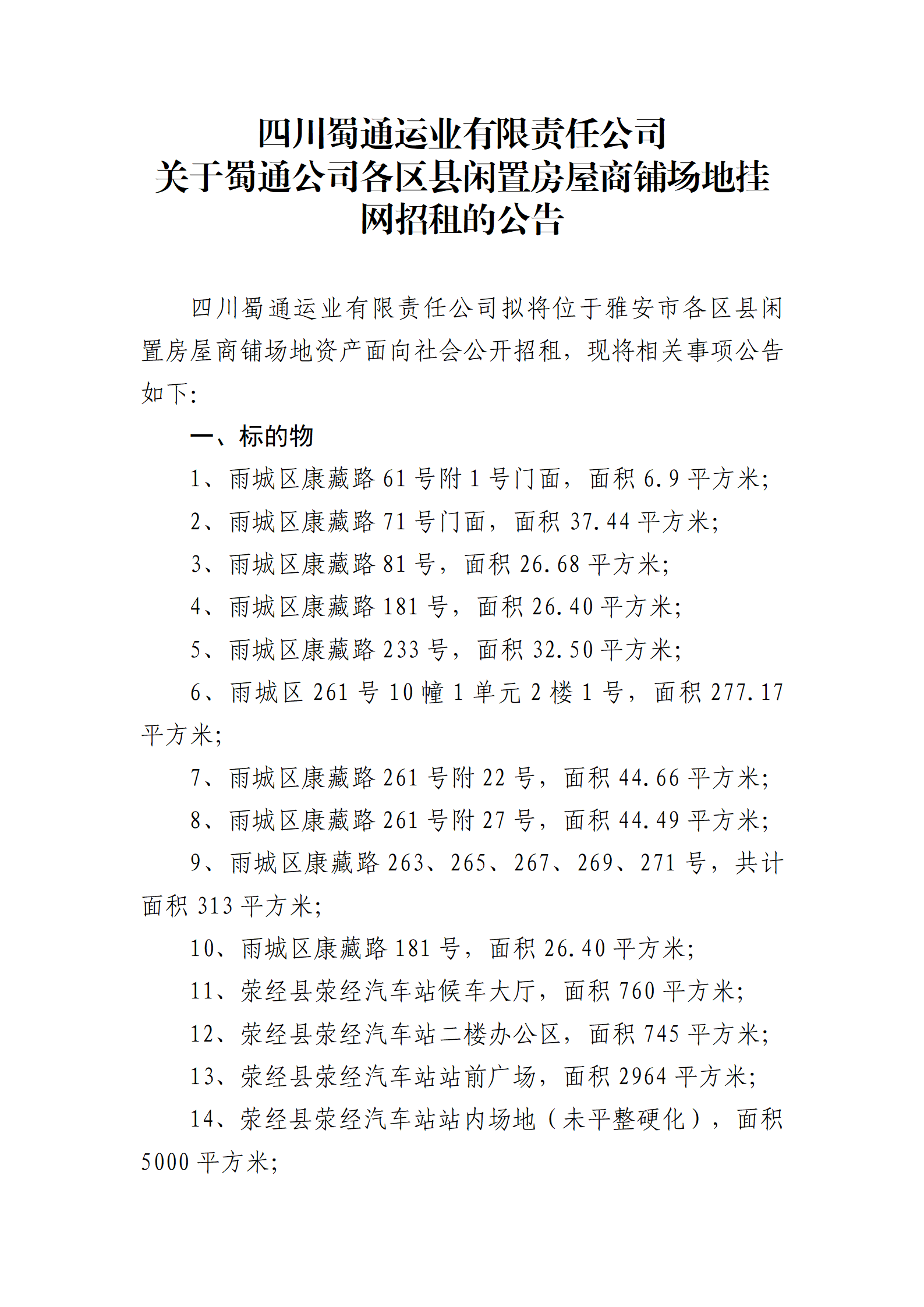 四川蜀通运业有限责任公司关于蜀通公司各区县闲置房屋商铺场地挂网招租的公告