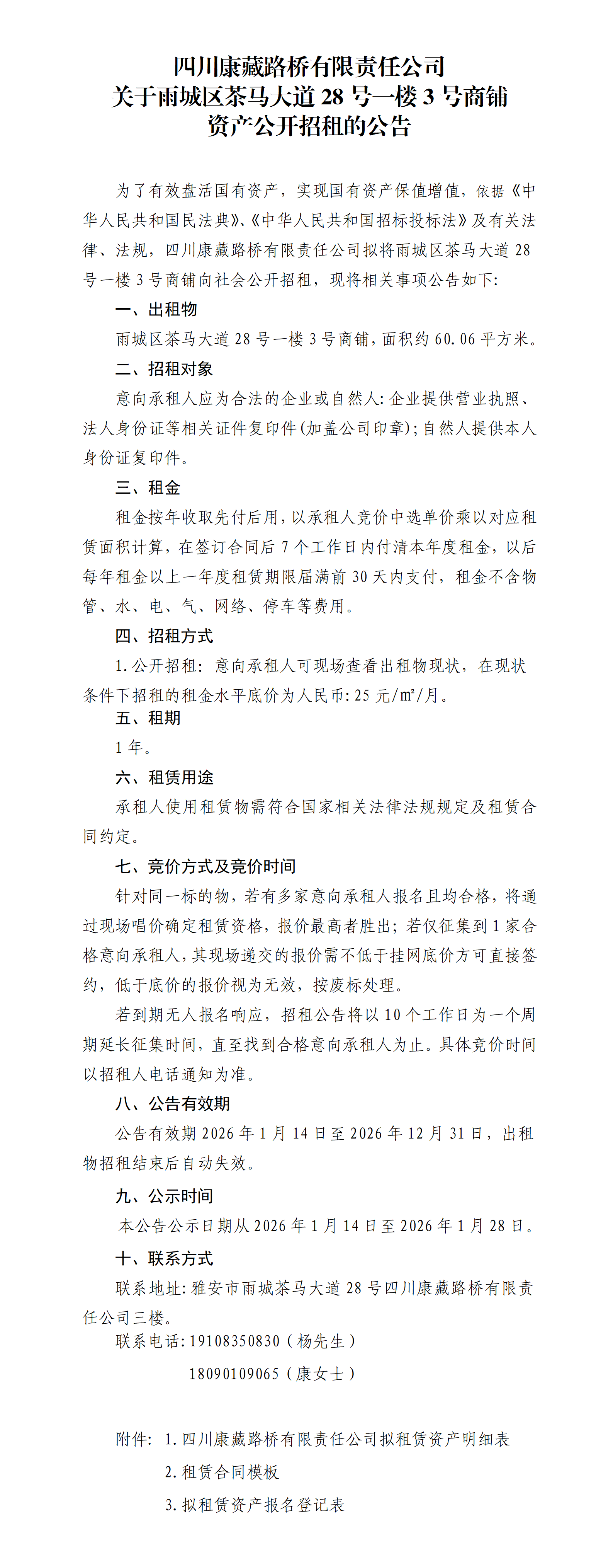 四川康藏路桥有限责任公司关于雨城区茶马大道28号一楼3号商铺 资产公开招租的公告