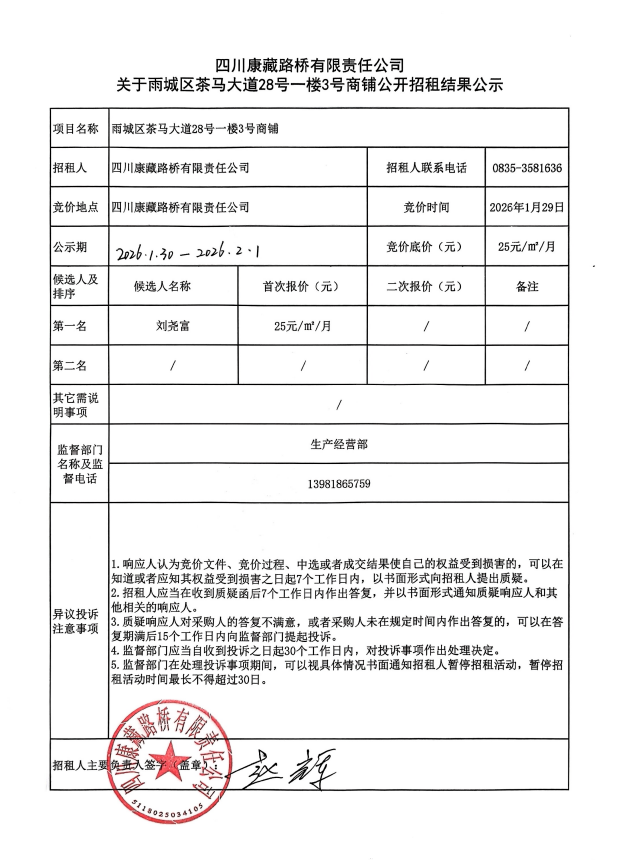 四川康藏路桥有限责任公司关于雨城区茶马大道28号一楼3号商铺公开招租结果公示