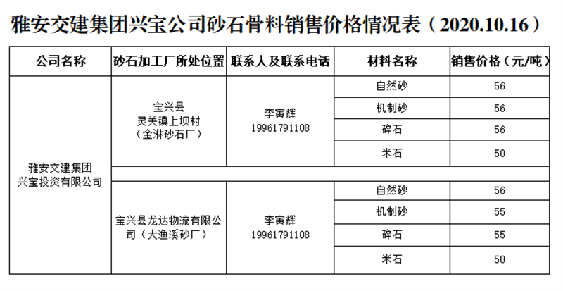 币游集团兴宝公司砂石骨料销售价格情况表(2020.10.16)
