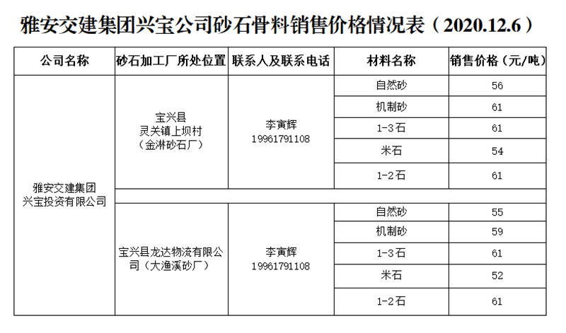 币游集团兴宝公司砂石骨料销售价格情况表(2020.12.6)