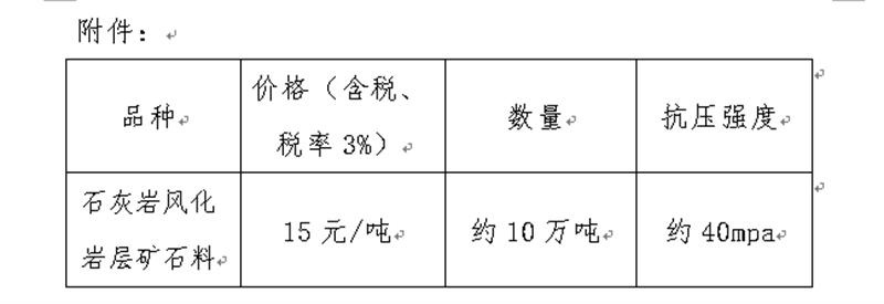 现将我公司矿山首采平台的石灰岩风化岩层矿石料定价出售事宜进行公示(见附件),经公司研究决定,定价出售风化岩层矿石料约10万吨,现顺利获得集团公司官网信息公示后对外销售。报名客户数不限,销售方式为先款后货,签约销售,销售时间以矿山开采和生产计划为准。