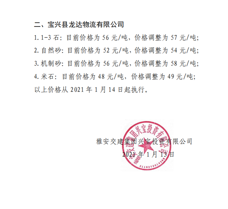 币游集团兴宝公司砂石骨料销售价格情况表(2021.1.14)