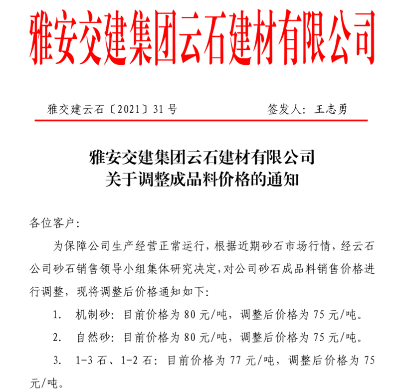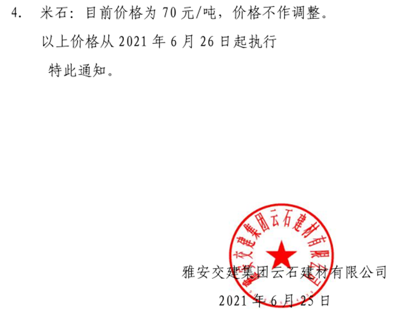 币游集团云石公司砂石骨料销售价格情况表(2021.6.24)