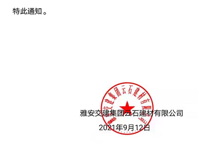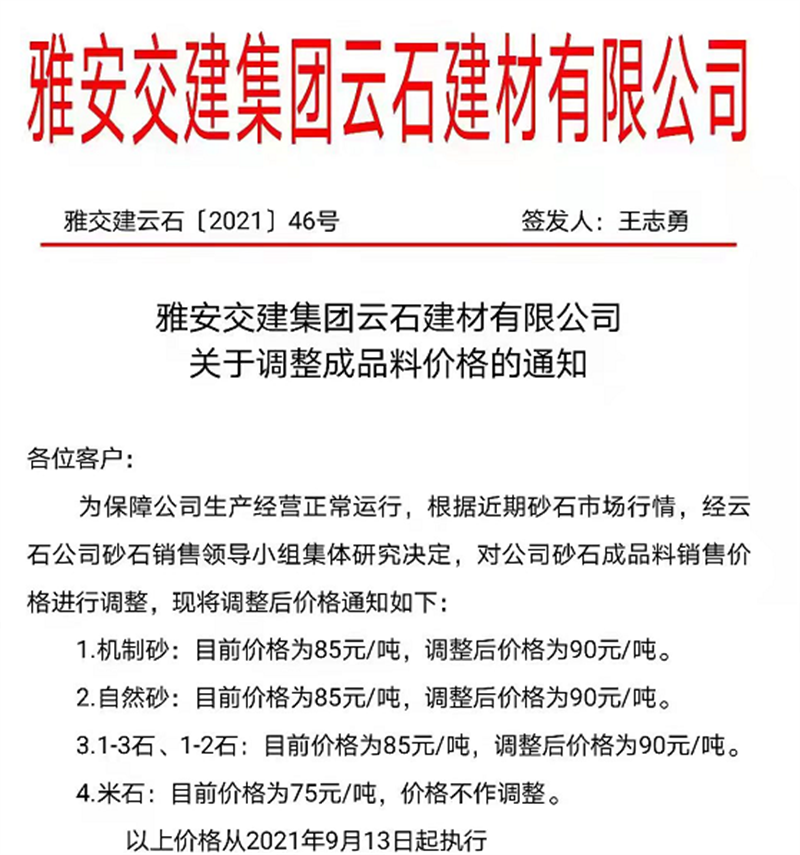 币游集团云石公司关于调整成品料销售价格的通知(2021.9.13)