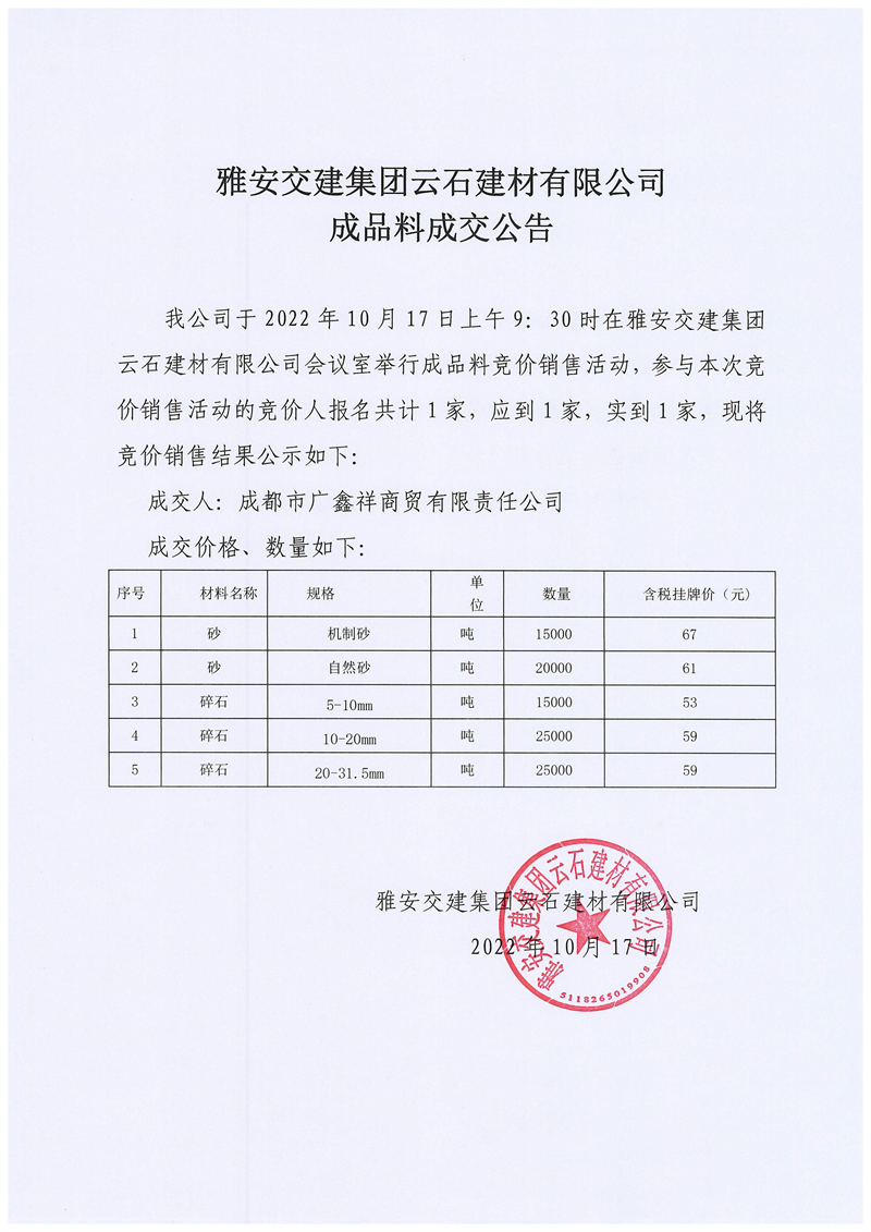 币游集团云石建材有限公司成品料成交公告10.17