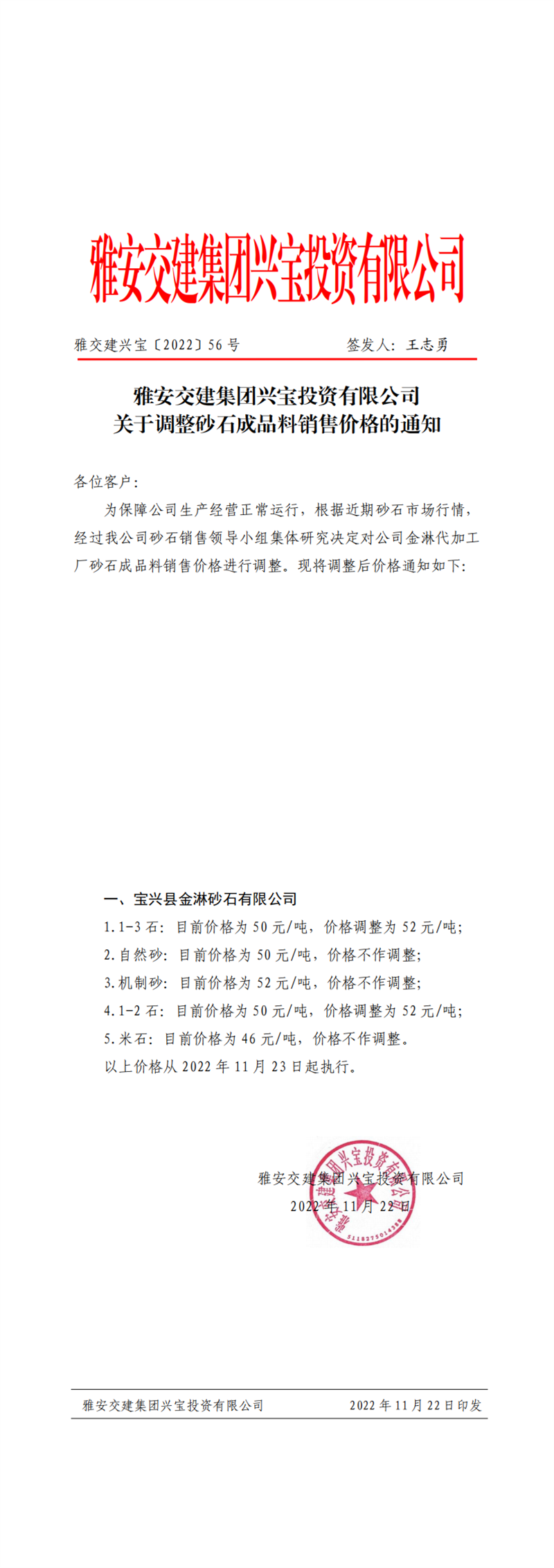 雅交建兴宝〔2022〕56号 关于调整砂石成品料销售价格的通知-11.22