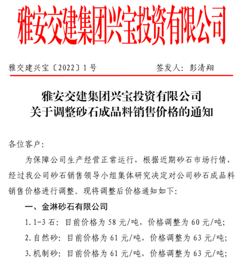 币游集团丹石公司关于调整砂石成品骨料销售价格的通知(2022.1.5)