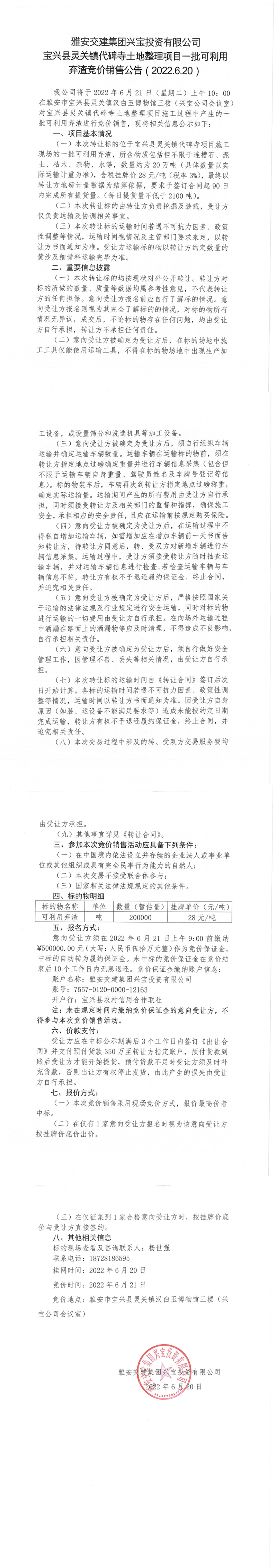 币游集团兴宝投资有限公司宝兴县灵关镇代碑寺土地整理项目-批可利用 弃渣竞价销售公告( 2022.6.21)