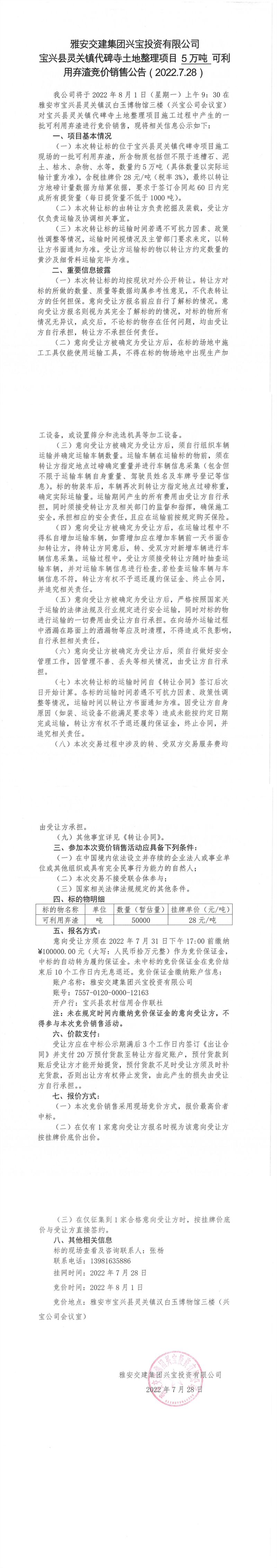 币游集团兴宝投资有限公司灵关镇代碑寺土地整理项目10万吨可利用弃渣竞价销售公告(2022.7.28)