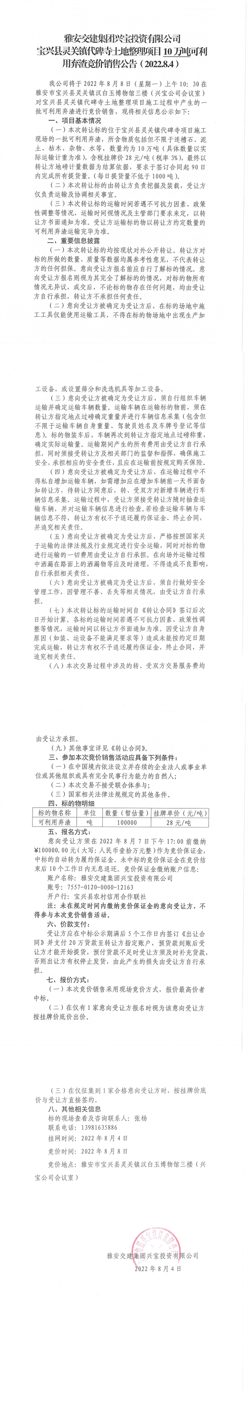币游集团兴宝投资有限公司灵关镇代碑寺土地整理项目10万吨可利用弃渣竞价销售公告(2022.8.4)
