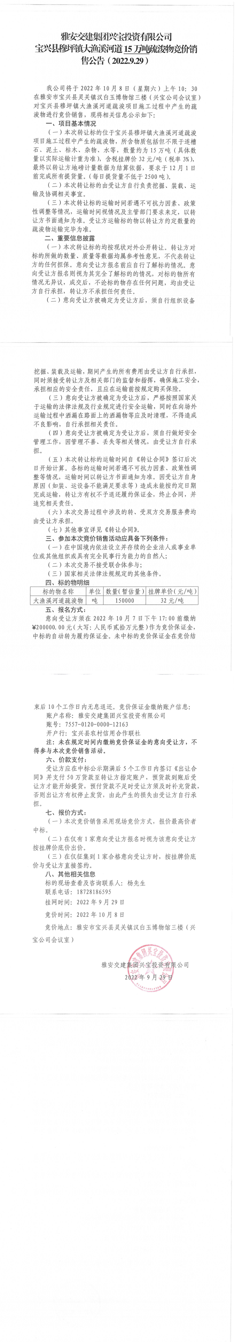 币游集团兴宝投资有限公司宝兴县穆坪镇大渔溪河道15万吨疏浚物竞价销售公告(2022.9.29)
