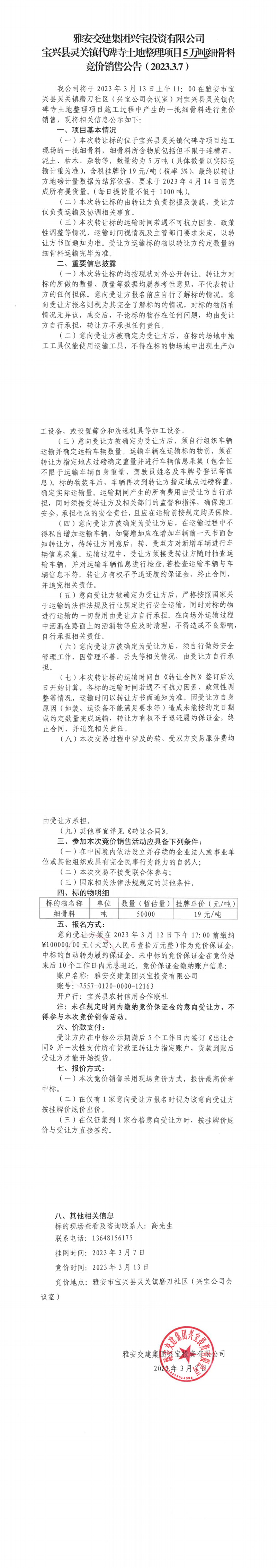币游集团兴宝投资有限公司宝兴县灵关镇代碑寺土地整理项目5万吨细骨料竞价销售公告(2023.3.7)