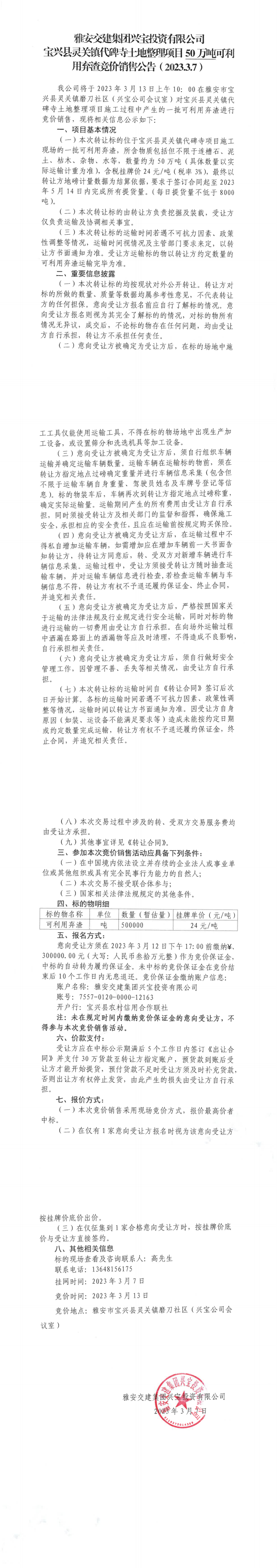 币游集团兴宝投资有限公司灵关镇代碑寺土地整理项目50万吨可利用弃渣竞价销售公告(2023.3.7)