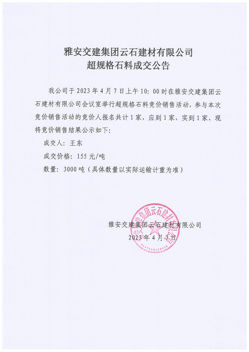币游集团云石建材有限公司超规格石料拍卖成交公告(2023-4-7)