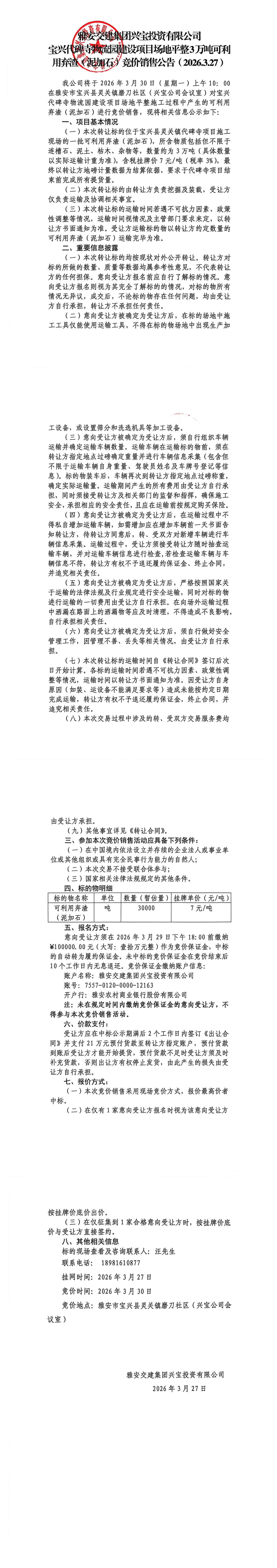 币游集团兴宝投资有限公司3万吨泥加石竞价销售挂网公告(2026.3.27)